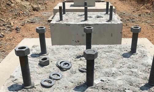 澆筑混凝土前,螺栓套板上部的螺桿及螺母須抹上黃油后用塑料布包裹并用鐵絲扎緊。澆筑混凝土,特別是采取泵送混凝土施工時,須避免混凝土的擠壓,導致地腳螺栓走位。